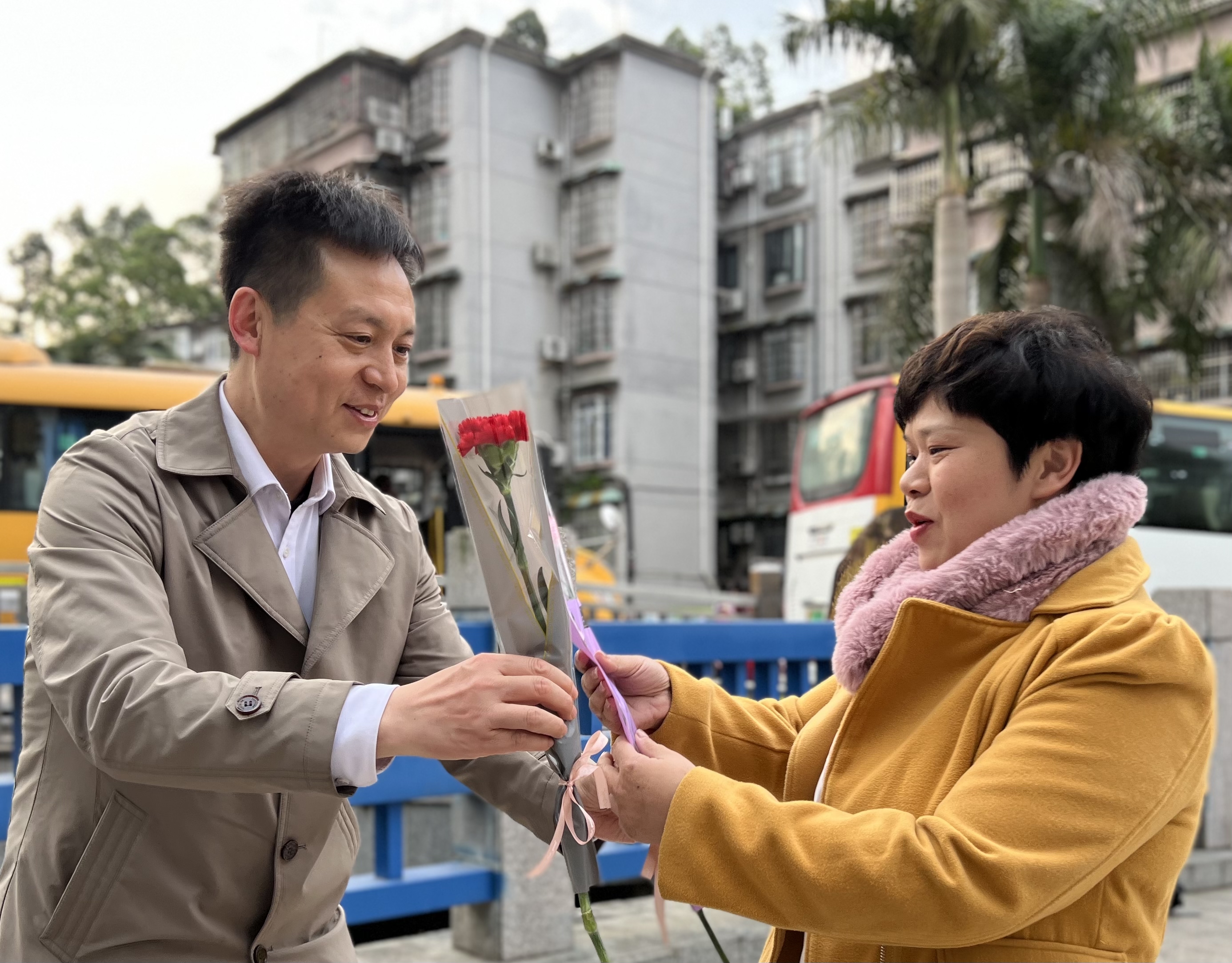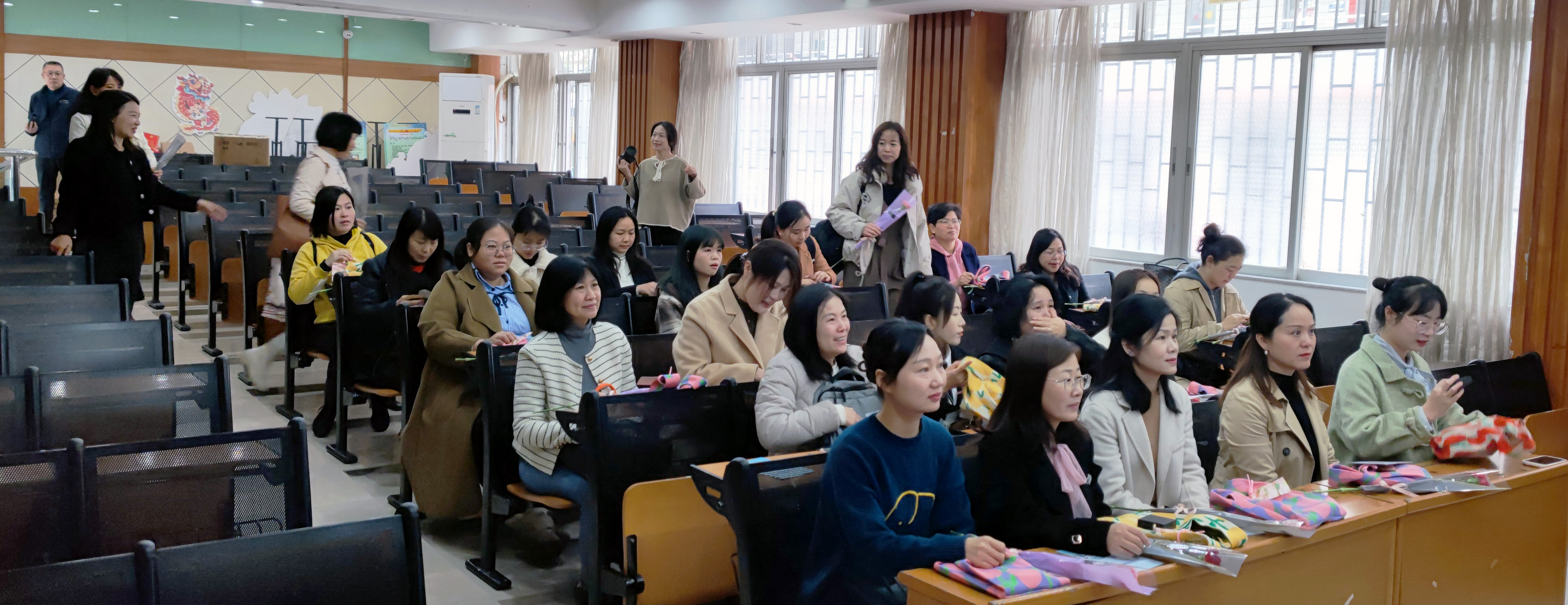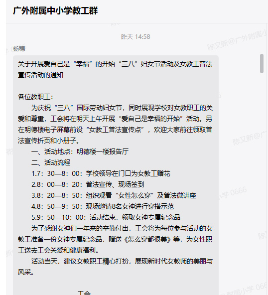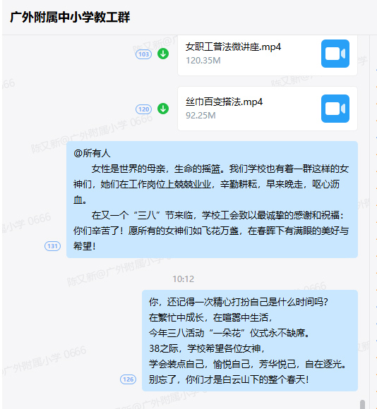 一大早,学校领导在门口为女教工赠送鲜花,工会委员组织女教职工在报告厅观看“怎么穿都很美”微讲座,现场邀请女教师进行穿搭示范,同时赠送女神专属纪念品。