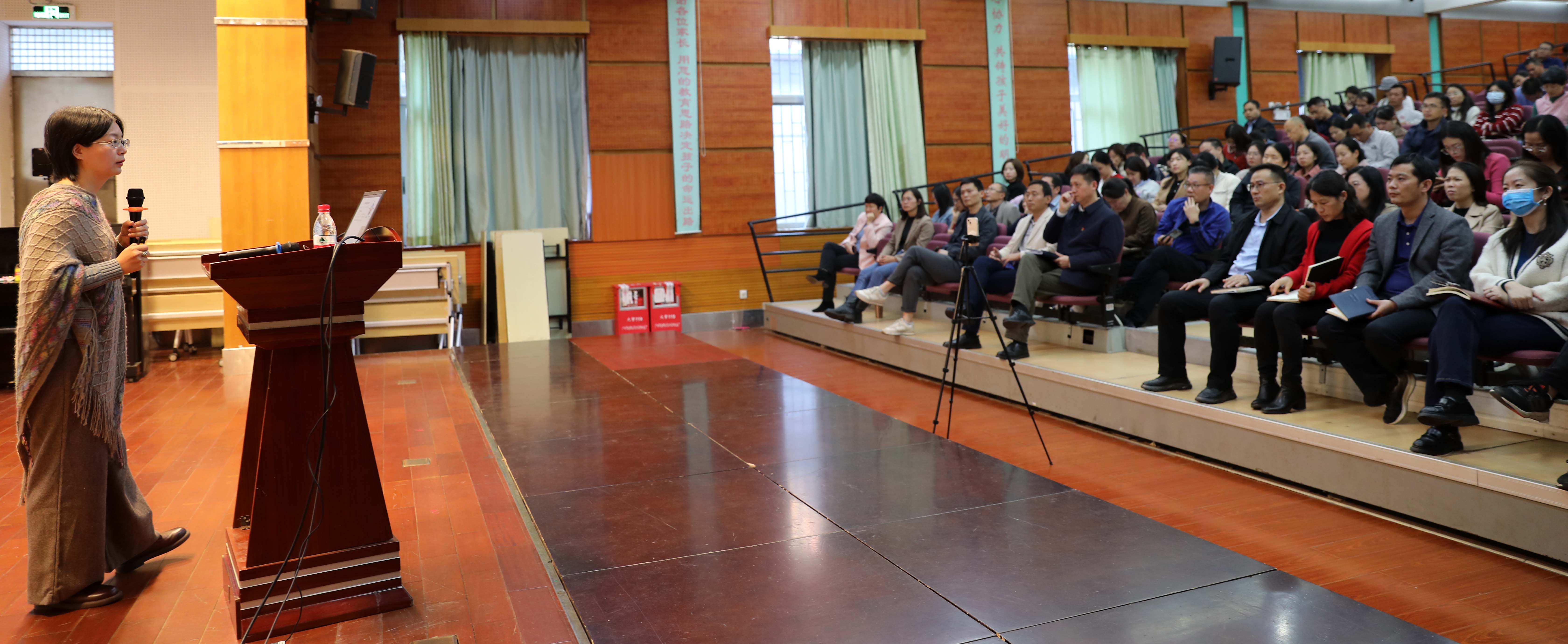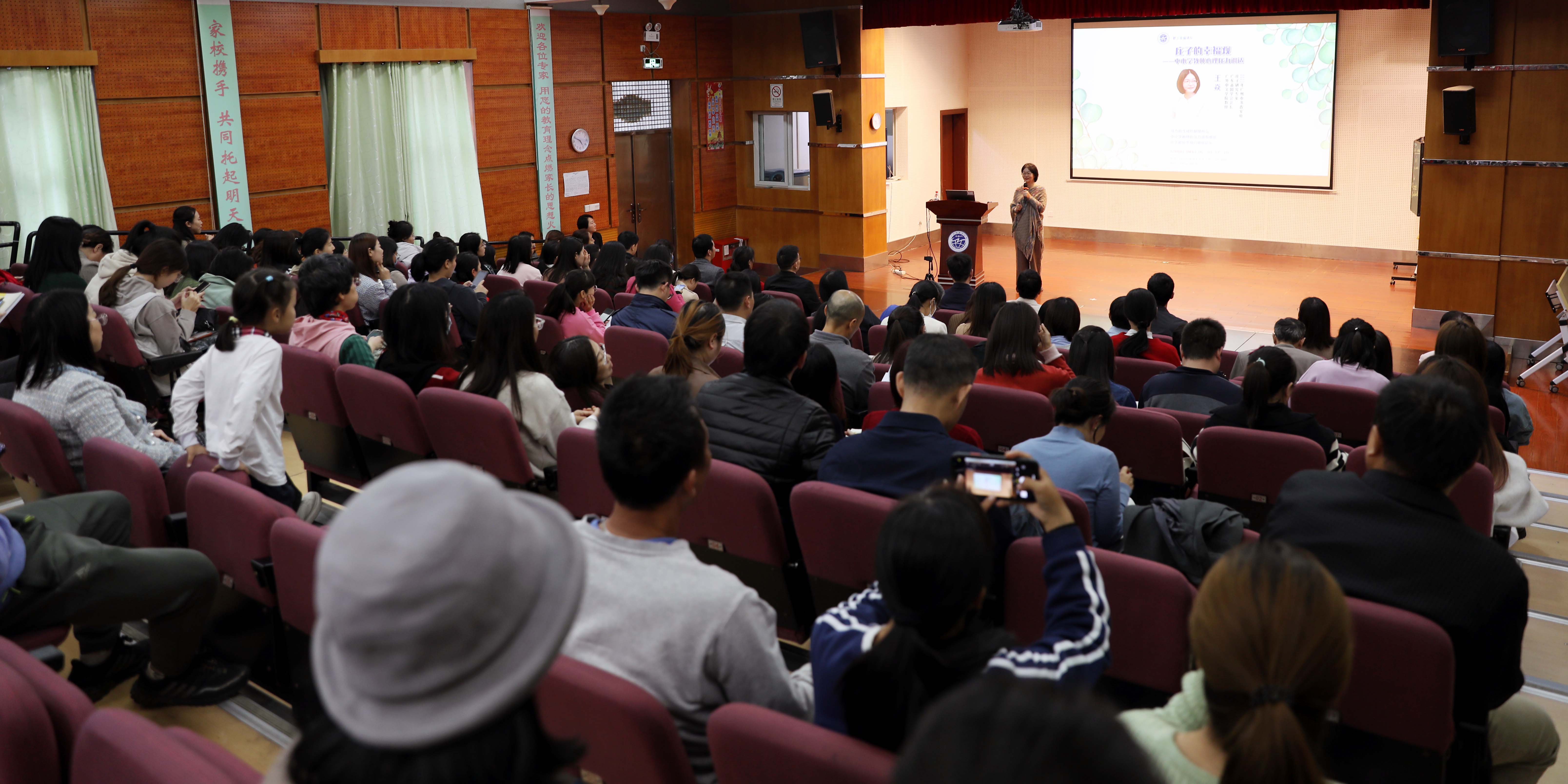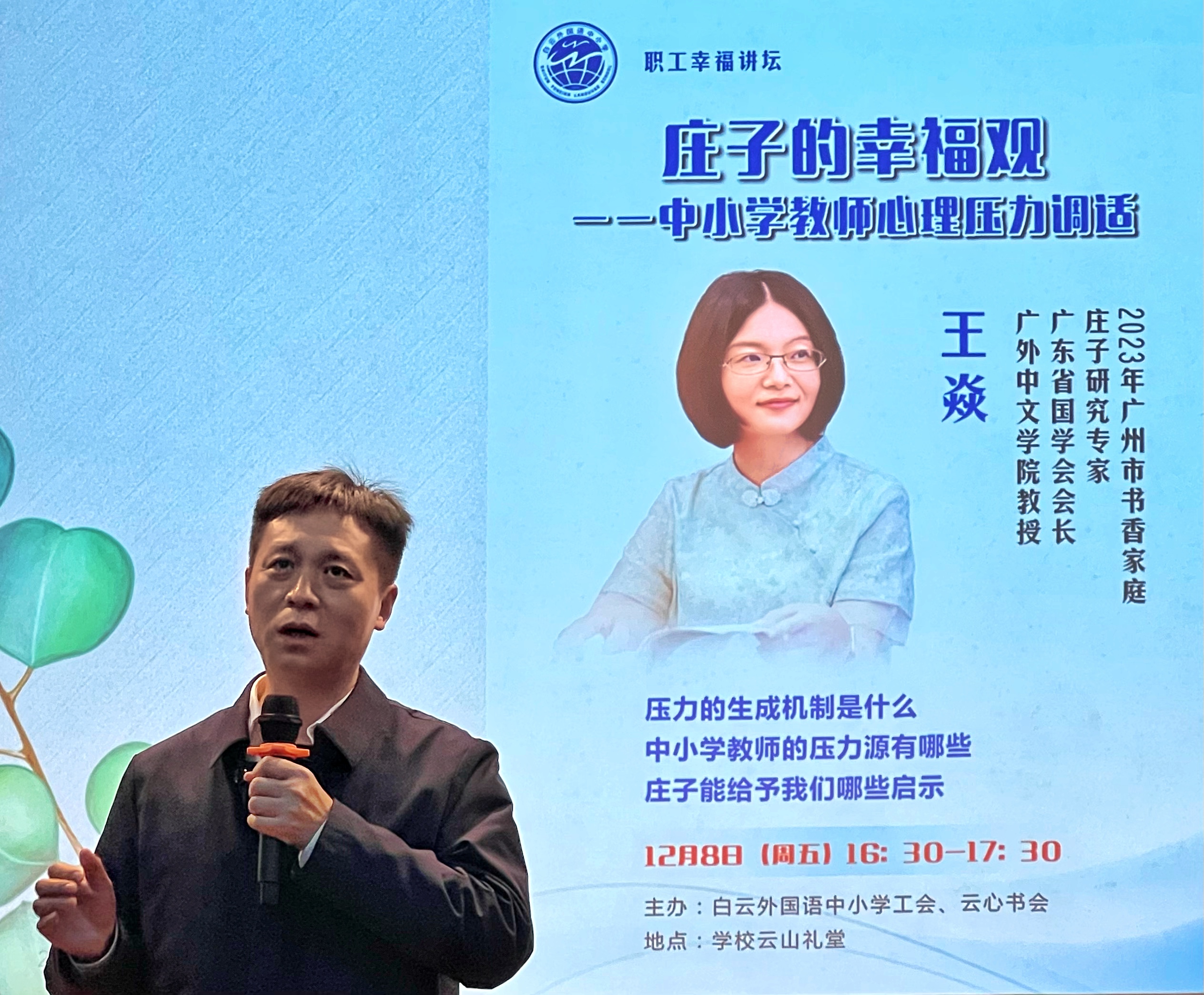 12月8日下午,附属中小学工会教职工幸福讲坛开讲,广外中文学院教授、广东省国学会会长、庄子研究专家王焱教授以“庄子的幸福观——中小学教师心理压力调适”做分享。朱传兵副书记主持。