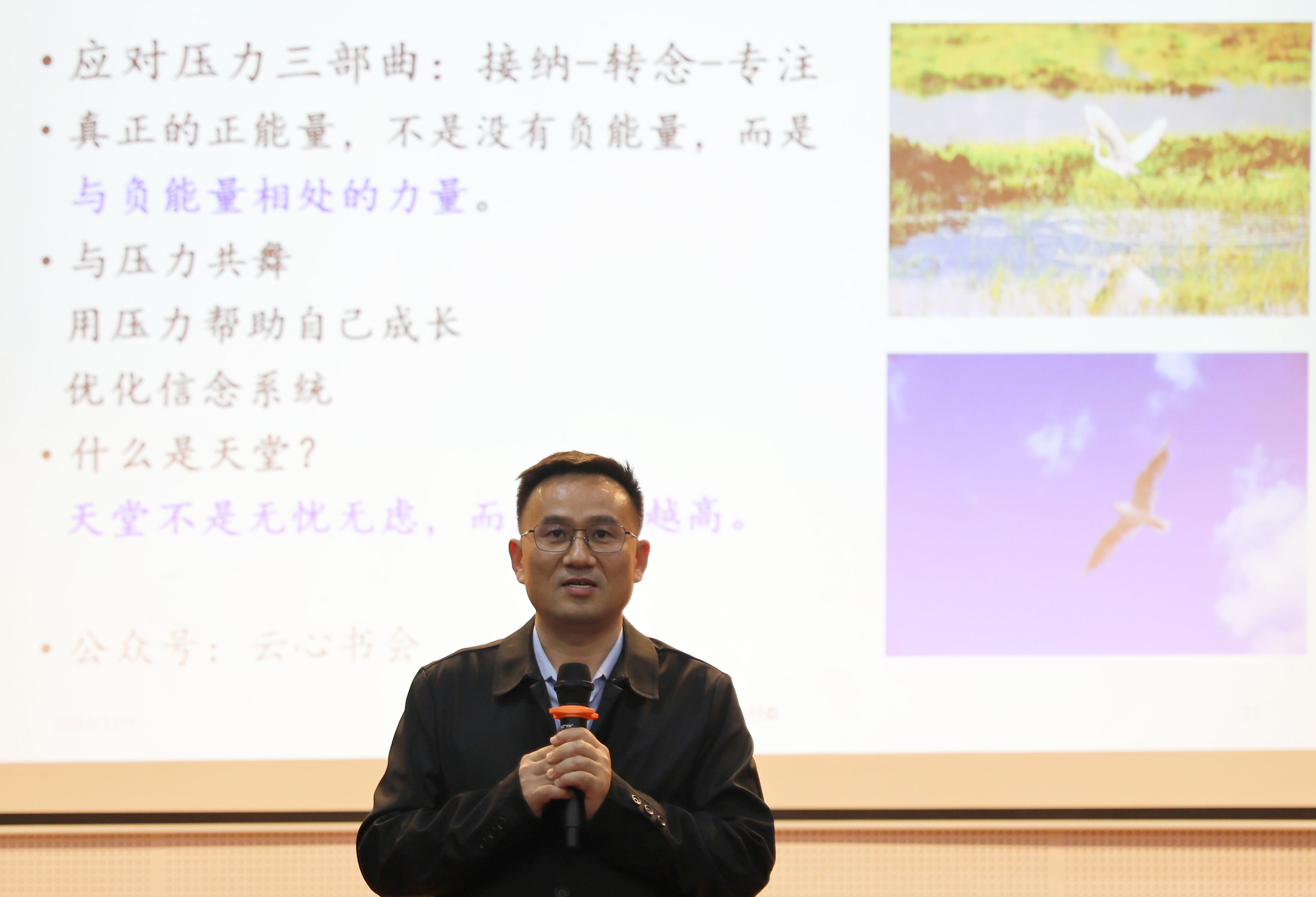 什么是压力?她认为事件就是压力。事件(A)+解释(B)=情绪(C),即压力源(事件)+信念(解释为威胁)=压力(情绪)。他结合《齐桓公遇鬼》的故事、马云写给高考落榜生的信、好消息与坏消息的相互转化和心理学家克拉姆的实验告诉老师们,一个人可以改变自己的态度来改变一生的信念解释系统。