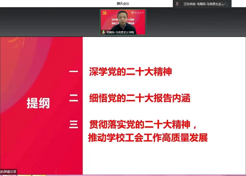 为深入学习贯彻党的二十大精神,12月1日,校工会邀请马克思主义学院院长、教授毛国民作题为“深学细悟党的二十大精神,推动工会事业高质量发展”专题讲座。本次讲座以线上会议的形式举行,由校工会常务副主席金良成主持。校教代会执委会委员、校工会委员会委员、经审委员会委员、二级工会主席以及校工会工作人员参加。