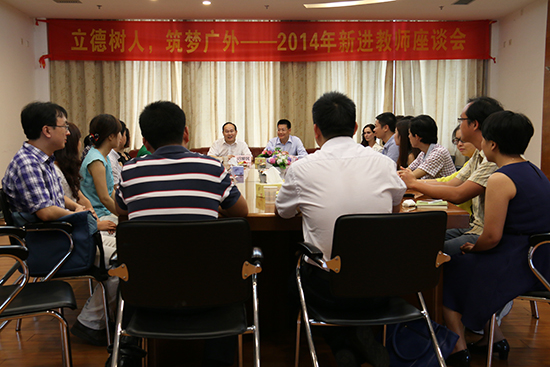 | 本网讯 9月10日迎来了第30个教师节,我校先后在南北校区举办两场教师节座谈会,分别为人事处、教师发展中心主办的新进教师座谈会和校工会主办的教职工代表座谈会,校长仲伟合出席两场座谈会与教师代表畅所欲言。南北校两场座谈会分别由副校长阳爱民、陈德萍主持。 在新进教师代表座谈会上,新进教师代表自我介绍都十分简短,但却都夸赞广外校园环境优美,表达了能来到广外任职的喜悦。听完老师们的自我介绍后,仲伟合第一句便说:“今天在这里不是要求各位老师为广外做什么,而是要问各位老师广外能为你们做什么。”仲伟合献上了教师节的祝福,又慷慨陈述了广外的“家史”,感叹广外在学科建设、人才培养、科学研究、对外合作交流等方面取得的明显的进步。 座谈会后,仲伟合与新进教师代表共进午餐。就餐时,仲伟合关切地问到老师是否已经把家安置好,学校的报道手续有没有做到“一条龙服务”,老师们则互相讨论教学工作怎么开展以及在新环境居住、饮食习不习惯,现场气氛越来越热烈。  在南校举办的新进教师代表座谈会