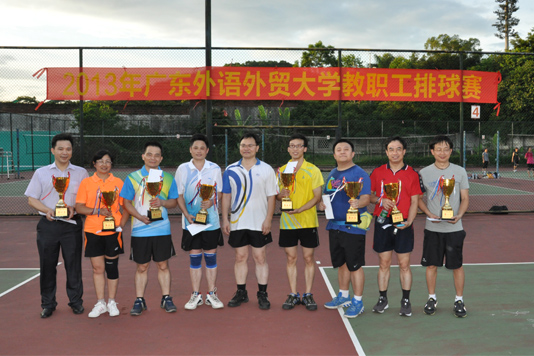 6月22日下午,由校工会主办、体育部承办的2013年广东外语外贸大学教职工排球赛在北校区排球场圆满落幕。继教公开学院队、机关队和教育新闻队分别获得冠亚季军。