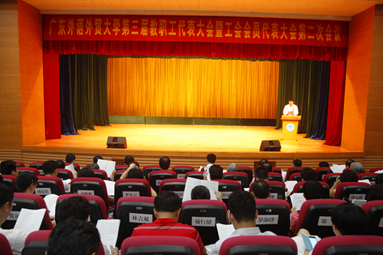 7月9日,学校第三届教职工代表大会暨工会会员代表大会(简称“双代会”)第二次会议在北校六教报告厅召开。大会讨论听取、讨论、审议2012年校长工作报告以及教代会、工会工作报告;听取、讨论、审议并通过了《广东外语外贸大学绩效工资实施方案》和《广东外语外贸大学第三届教职工代表大会暨工会会员代表大会第二次会议决议》。