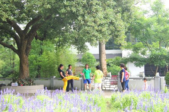 树荫下,大家一起踢毽子,其乐融融