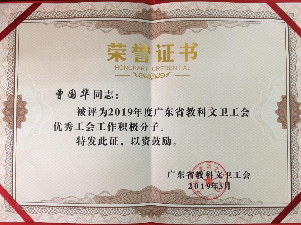 经二级工会民主推荐上报,校工会委员会讨论审议,广东省教科文卫工会评选,我校继教学院工会和李旭武、杨成杰、曾国华三位同志获得表彰。